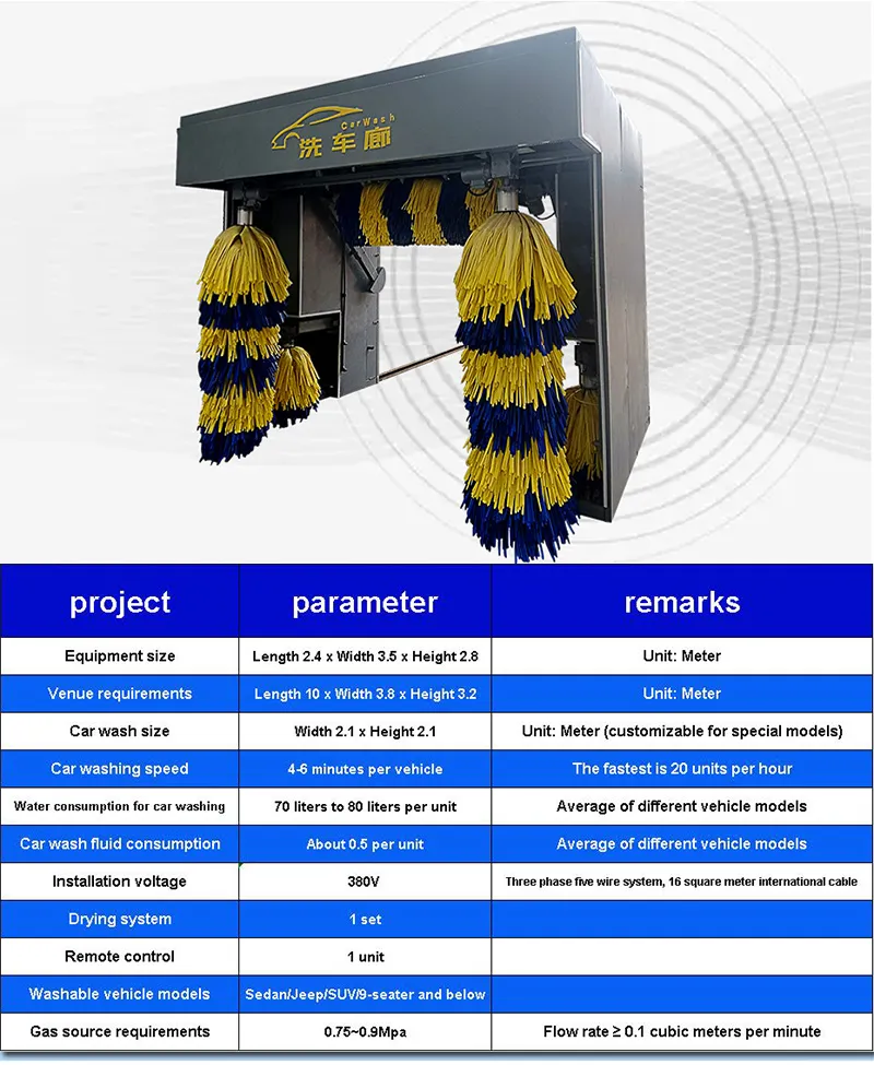 The brush is made of wear-resistant material and can automatically adjust the pressure according to the vehicle model, effectively removing stubborn stains while reducing paint damage. This device takes about 5-8 minutes for a single car wash and is suitable for scenarios such as car 4S stores, gas stations, and large parking lots.