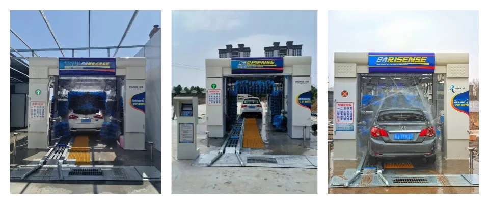 This tunnel car wash system has 7 car brushes: 1 vertical lift overhead brush, 2 large vertical brushes and 4 small vertical brushes. This system features a PLC automatic computer control system, ensuring high security and washing efficiency.